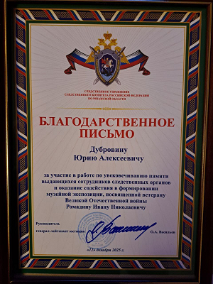 В мероприятии принял участие член Совета ветеранской организации Юрий Алексеевич Дубровин, оказавший помощь в организации экспозиции, а его вклад был отмечен благодарственным письмом руководителя СУ СК России по Рязанской области О.А. Васильева.
